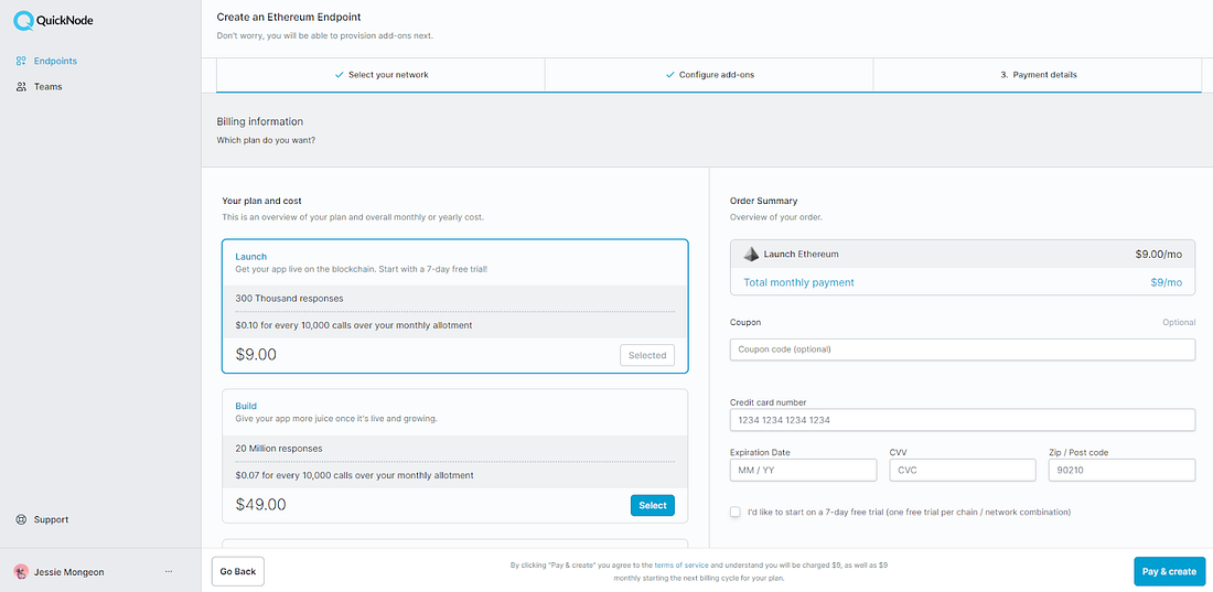 10. Selecione o nível do seu plano de pagamento e insira suas informações de pagamento. Em seguida, selecione 'Pagar e criar'.