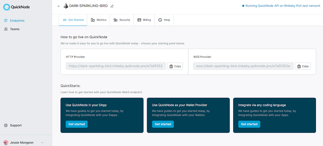 QuickNode é uma plataforma que permite implantar dApps e outros aplicativos em mais de 12 diferentes redes blockchain com provisionamento e disponibilidade imediatos. O QuickNode oferece uma variedade de ferramentas e análises poderosas, todas apresentadas por meio de um único painel de controle.