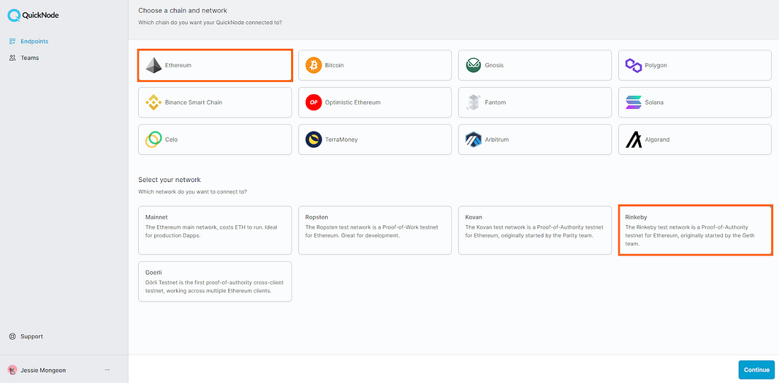 8. Selecione a blockchain Ethereum e, em seguida, selecione a rede Rinkeby.