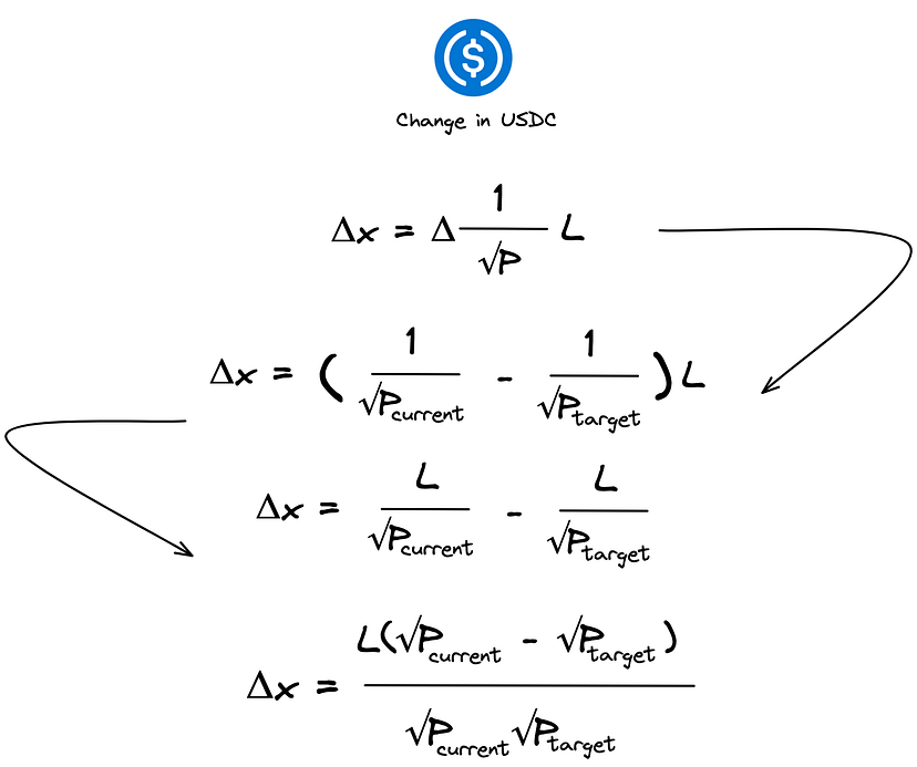 Em seguida, obtemos nossa fórmula para inserir nosso atual √P e nosso √P alvo. Tomando a fórmula de mudança no USDC, expandimos e alteramos para obter nossa fórmula para calcular a quantidade de USDC.