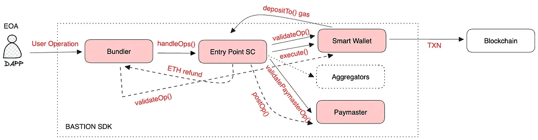 Bastion é um SDK de abstração de contas modular, leve e de código aberto projetado para simplificar a integração de funcionalidades de carteira descentralizada em suas aplicações. Escrito em TypeScript e totalmente compatível com ERC4337, o Bastion garante segurança de tipo, ao mesmo tempo que oculta as complexidades das interações com blockchain.