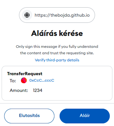 A estrutura real que enviamos para a MetaMask assinar está contida na variável transfer_request. O bloco types contém as definições de tipo. Aqui, o primeiro elemento é a definição obrigatória do EIP712Domain, que descreve os metadados. Isso é seguido pela definição real da estrutura, que neste caso é a TransferRequest. Esta é a estrutura que aparecerá na MetaMask para o usuário. O bloco domain contém o valor específico dos metadados, enquanto a mensagem contém a estrutura específica que desejamos assinar com o usuário.