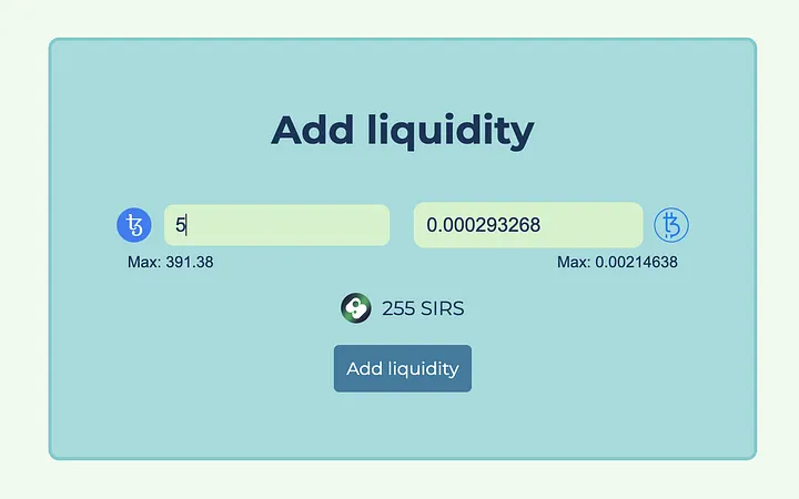 Ao inserir um número em um dos campos, o dapp deve calcular a quantidade correspondente do outro token, bem como a quantidade esperada em SIRS que será recebida.