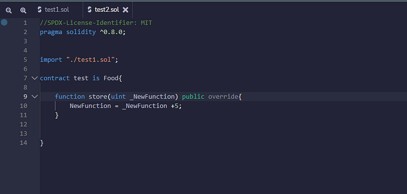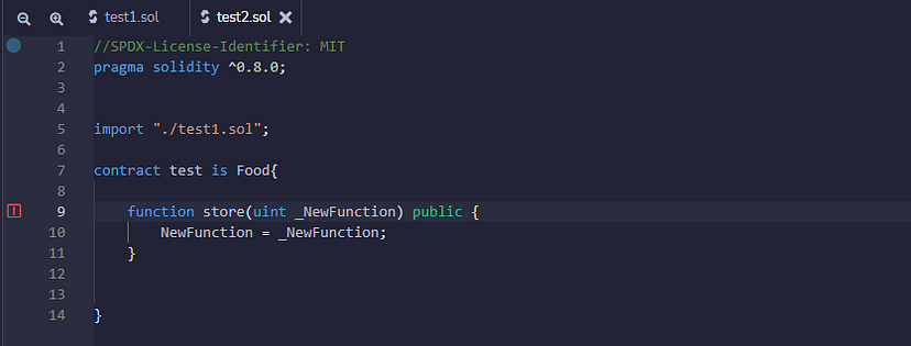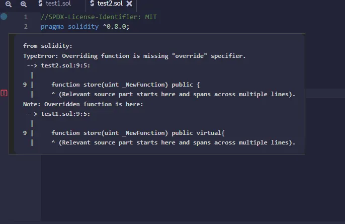 O Solidity está avisando que temos duas funções de contrato idênticas, e recomenda que substituamos a função no test1 para podermos usá-la no test2.