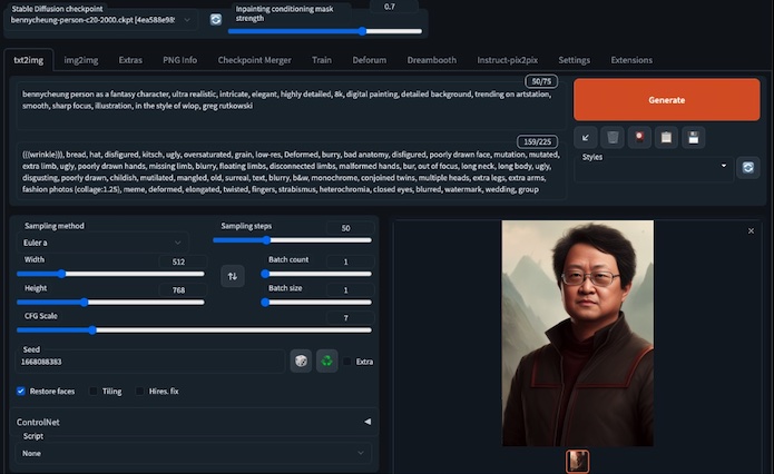 Figura. Use o Stable Diffusion (via interface do usuário da Web AUTOMATIC1111 ) para gerar a imagem do avatar a partir de um prompt.