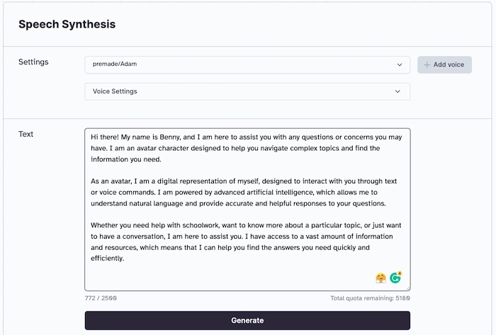 Para gerar a voz do seu avatar de IA, comece fornecendo ao ElevenLabs o script que geramos usando o ChatGPT. O ElevenLabs usará técnicas avançadas de aprendizado profundo para gerar uma voz que corresponda ao script.