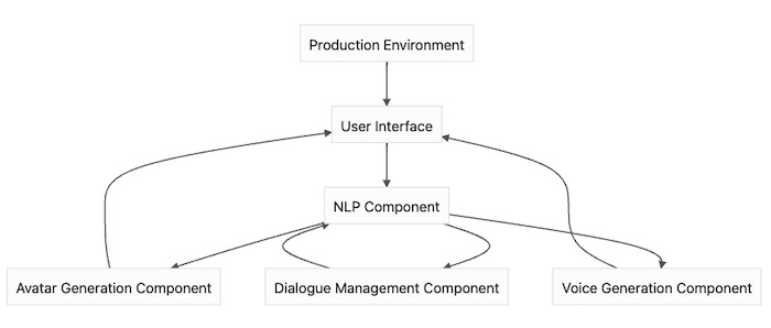Figura. Neste diagrama, a interface do usuário (A) é conectada ao componente NLP ( B ), que, por sua vez, está conectado ao componente de geração de avatar ( C ) e ao componente de geração de voz ( D ). O componente de geração de avatar e o componente de geração de voz enviam sua saída de volta à interface do usuário, e o componente de gerenciamento de diálogo ( E ) é responsável por gerenciar o fluxo da conversa entre os componentes. Finalmente, todo o sistema é integrado e implantado em um ambiente de produção ( F ).