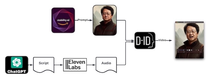 Figura. Ilustração do fluxo de trabalho de criação do avatar animado com IA. (1) Geração da imagem do avatar usando Stable Diffusion (2) Geração de texto usando ChatGPT (3) Geração de uma voz usando ElevenLabs (4) Combinação da imagem do seu avatar e da voz gerada usando D-ID.