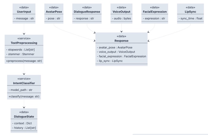 Também analisamos os modelos de dados e as estruturas de classes envolvidas na criação de um sistema de chatbot animado e como a entrada do usuário é processada e classificada para gerar respostas apropriadas. Examinamos os vários componentes envolvidos na geração da expressão facial e sincronização labial do avatar, bem como a saída de voz sincronizada com os movimentos do avatar.