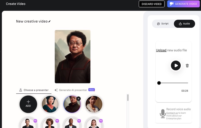 Figura. Use o D-ID para fazer upload do arquivo de áudio gerado e adicione a imagem de avatar personalizada para gerar vídeo