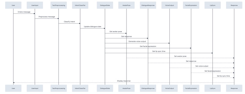Quando o usuário digita uma mensagem ou comando, o Chat Bot usa o processamento de linguagem natural (NLP) para entender a intenção do usuário e gerar uma resposta apropriada. A resposta será traduzida em texto, que será usado como base para gerar uma resposta animada do avatar do Chat Bot.