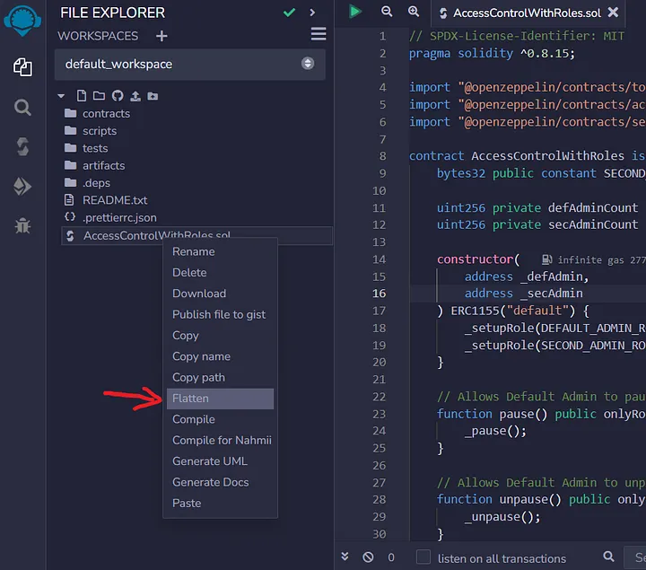 Clique com o botão direito do mouse no arquivo Solidity e selecione “ Flatten ”.