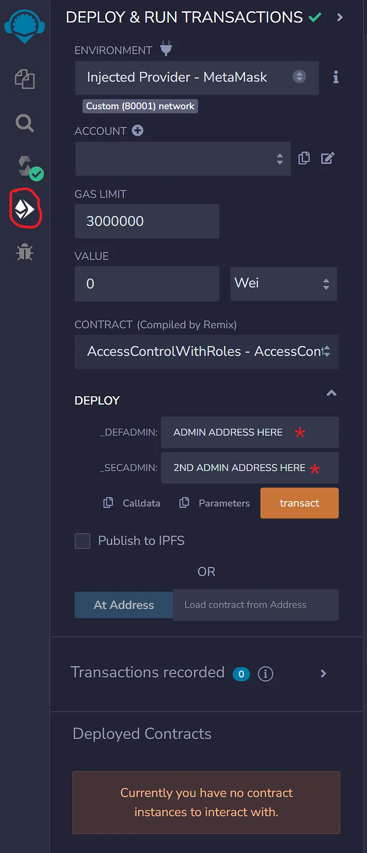 Selecione “ Fornecedor injetado — MetaMask ” para conectar-se à sua carteira MetaMask. Cole os endereços da carteira nos campos e clique em “ transact ” para implantar.