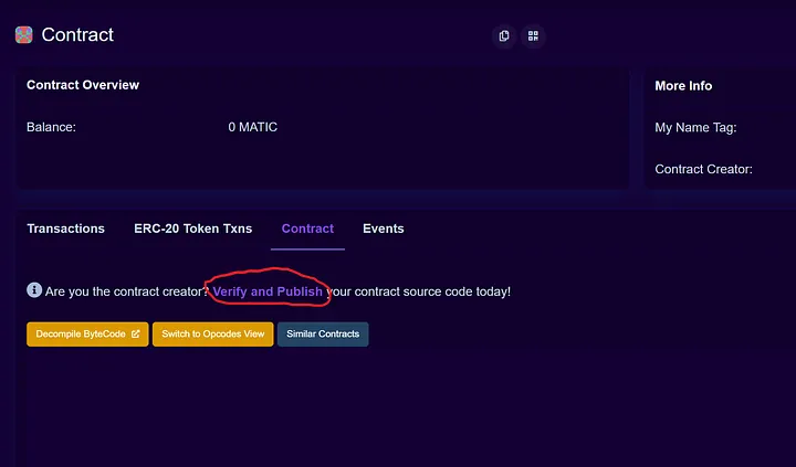 Antes de podermos ler nosso contrato inteligente na Polygonscan, precisamos primeiro verificar e publicar.