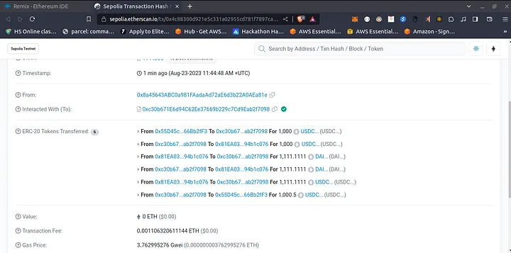 **1000 USDC** do contrato AaveLendingPoolpara o contratoFlashLoanArbitrage.Depósito de