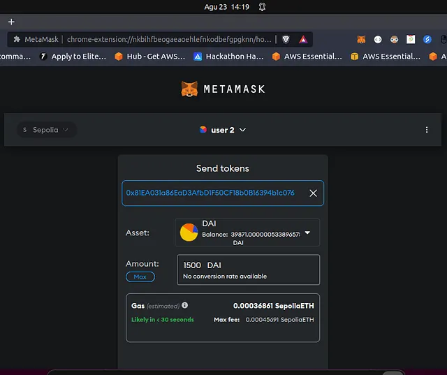 Dexpara o contratoFlashLoanArbitrage.Depósito da quantia de DAI no contrato
