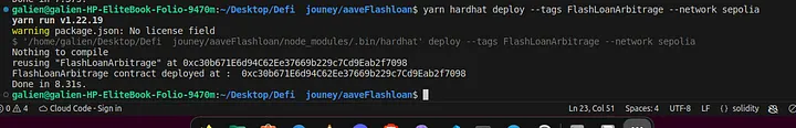 Em seguida, implantamos o contrato FlashLoanArbitrage.sol executando o comando abaixo: