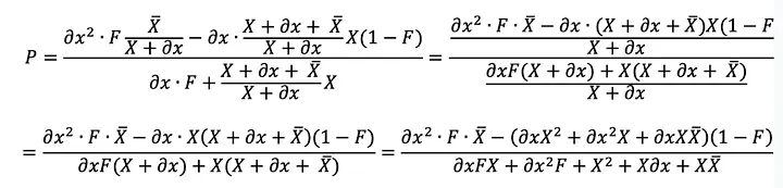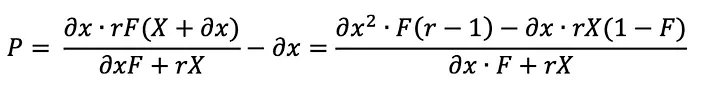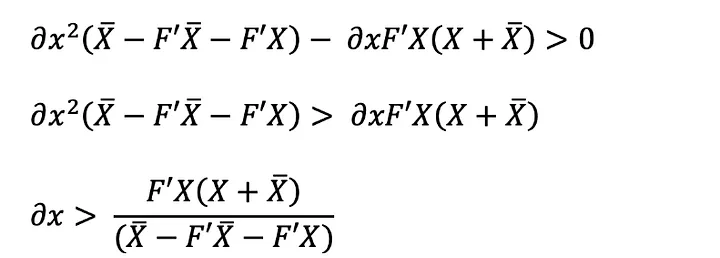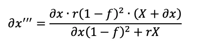 Agora, vamos calcular o lucro de arbitragem de uma transação sanduíche reversa. A receita (excluindo as taxas de gás) é igual a ∂x''' — ∂x. Por conveniência, substituiremos F por (1-f)²: