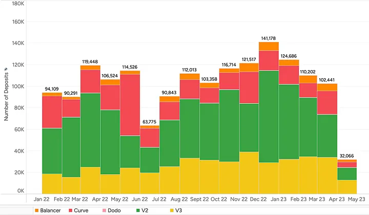 No entanto, comparado com o número total de eventos de provisão de liquidez, o número de ataques é bastante limitado. Para referência, segue abaixo o gráfico que mostra o número total de depósitos de liquidez por protocolo no ano passado.