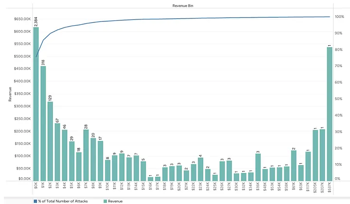 Abaixo está a função de distribuição de probabilidade da receita total e número de ataques por faixas de receita de US$ 1.000. Ataques com receita abaixo de US$ 1.000 constituem 75% de todos os ataques, mas geram apenas 11% de toda a receita.