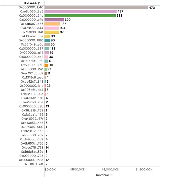O bot principal é 0x000000…b40 — esse contrato fez 470 ataques e produziu US$ 1,57 milhão em receita. Parabéns ao 0x000000…b40!