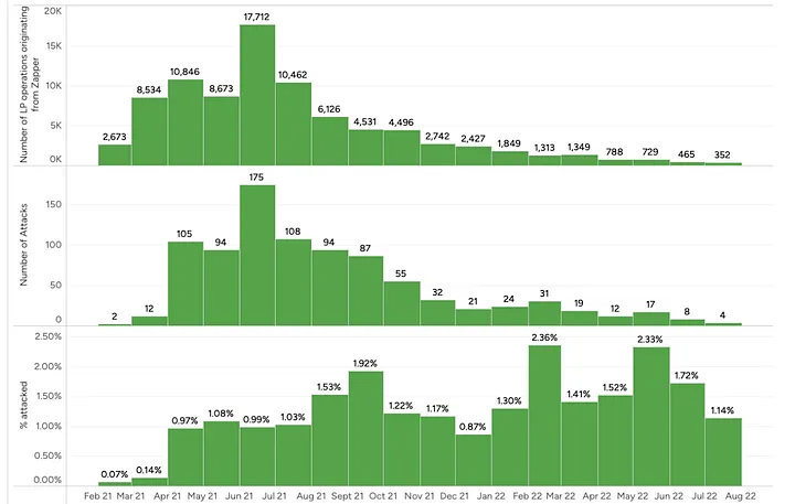 Um roteador que se destaca é o Zapper.fi - parece que entre maio de 2021 e julho de 2022 a proporção de depósitos de LP atacados originários do Zapper foi muito maior do que em qualquer outro roteador. Suspeitamos que a tolerância de derrapagem estava ou muito solta por padrão ou não foi implementada. Também parece que o Zapper parou de oferecer a seus usuários a opção de depositar fundos em pools AMM por volta de julho de 2022.