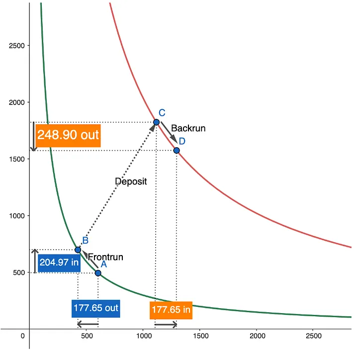 Os pontos A e B mostram o estado da pool antes e depois do front-run e os pontos C e D mostram o estado da pool antes e depois do back-run.