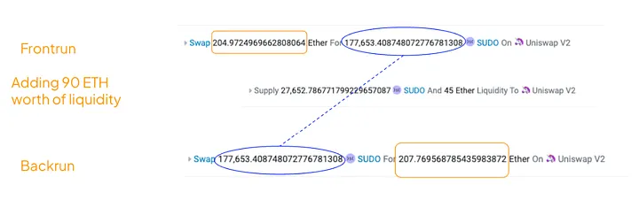 O atacante detecta um depósito futuro no valor de 90 ETH em liquidez em uma pool SUDO-WETH e cria um pacote MEV, envolvendo a transação de depósito em um sanduíche de 3 pedaços: