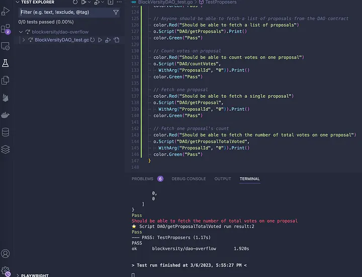 E é isso! Vamos voltar ao nosso conjunto de testes e adicionar todas essas novas transações e scripts para garantir que tudo funcione conforme o esperado. Para economizar tempo, você pode simplesmente pular para o repositório de amostra BlockVersityDAO e copiar a configuração do arquivo Flow.json caso o Overflow não esteja em execução para você. O conjunto completo de testes Go deve ficar assim: