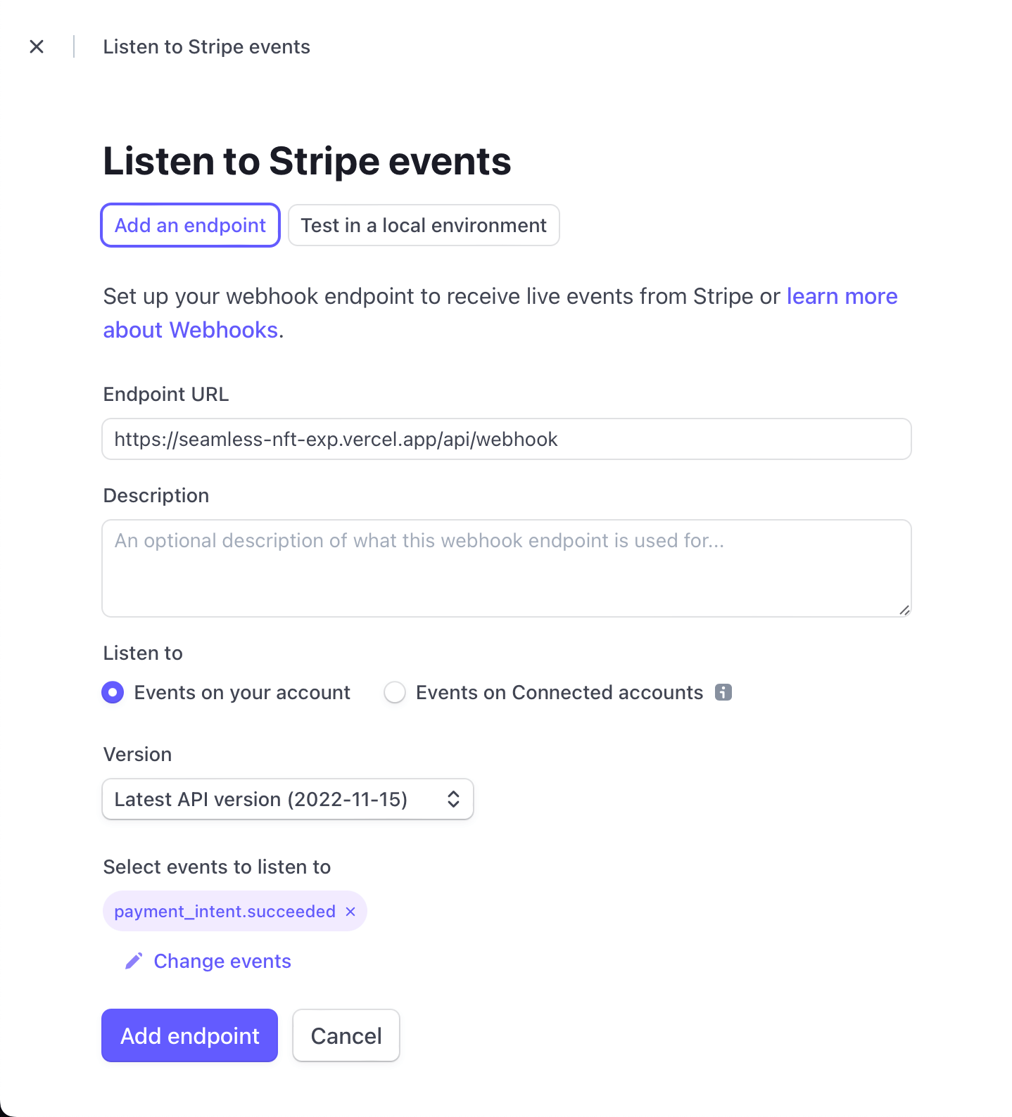 Por fim, precisamos adicionar um ponto de extremidade no webhook para a Stripe. Vá até a seção webhooks em developers (desenvolvedores) e clique em “Add an endpoint” (adicionar um ponto de extremidade). Então, adicione seus detalhes: