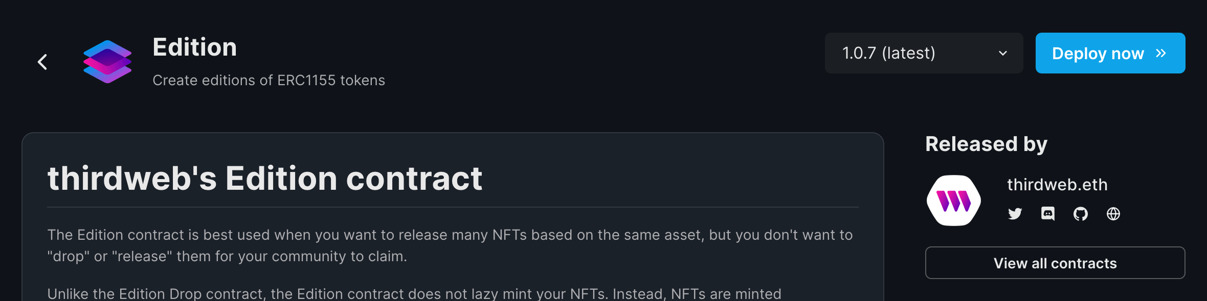 Aqui, selecione o contrato inteligente de sua escolha. Para este guia, vamos utilizar o contrato Edition (de edição) para criar nossa coleção NFT. Clique em “Deploy Now” (implantar agora) para começar o fluxo de implantação: