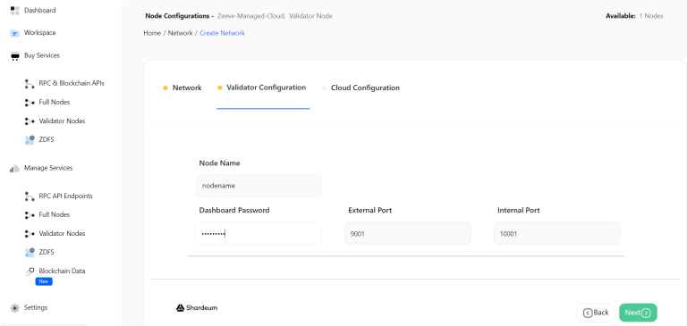 1.Vá para “Nós validadores” (Validator nodes) em “Comprar serviços” (Buy Services) e clique na rede “Shardeum” para acessar uma página que solicita que você forneça detalhes da inscrição do nó, como tipo de nuvem, tipo de nó e número de nós que deseja implantar.