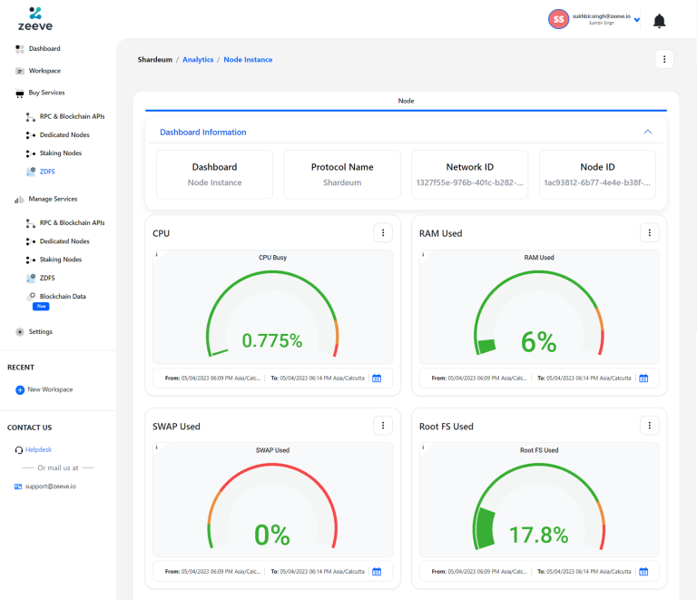 O Zeeve fornece monitoramento de nó avançado 24 horas por dia, 7 dias por semana, para garantir que seu nó validador da Shardeum esteja íntegro e funcionando ativamente para sempre. Além disso, o painel de monitoramento envia alertas preditivos sobre possíveis falhas no nó, para que os problemas possam ser corrigidos com antecedência e o nó nunca fique inativo. Como você pode ver na imagem abaixo, o painel mostra parâmetros de monitoramento específicos do nó Shardeum, como uso da CPU, uso da RAM, Swap usado e Root FS usado.