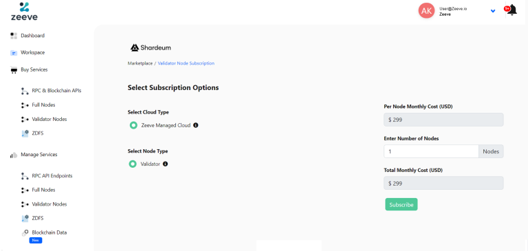 2.Depois de preencher todos os detalhes, clique em “Inscrever-se” (Subscribe) e conclua o processo de pagamento. Vá para “Serviços Gerenciados” (Managed Services) —> “Nós validadores” e adicione uma nova rede Shardeum. Adicione detalhes específicos da rede, como: