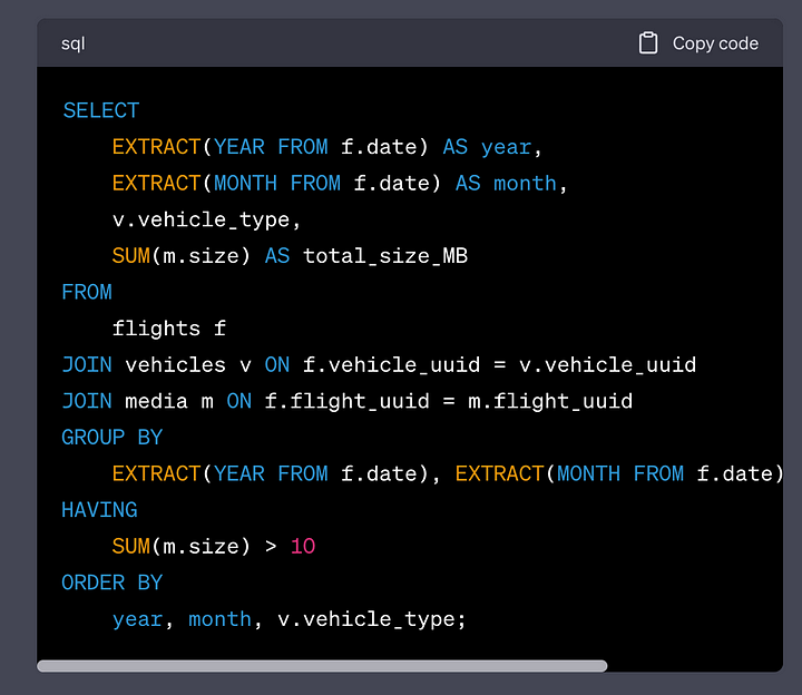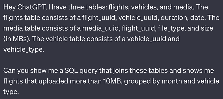 Na realidade, passei a hora seguinte dando mais uma dúzia de prompts até ter 150 linhas de SQL que, de outra forma, estariam além das minhas capacidades. Agora, para ser claro, o ChatGPT cometeu erros, como um humano faria. Eu fui capaz de apontar os erros e conseguimos progredir.