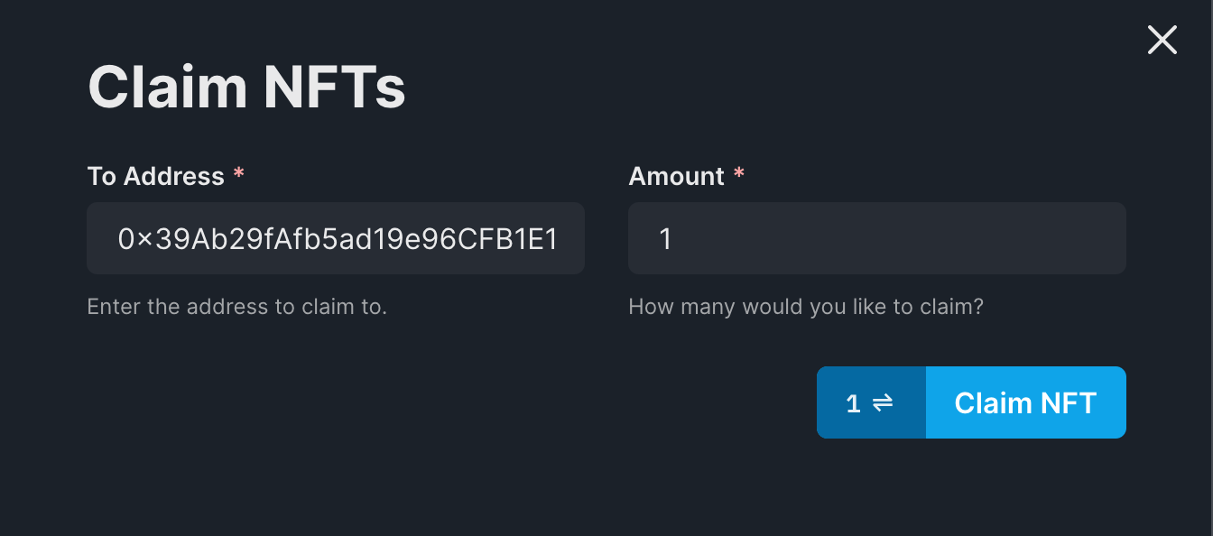 Digite o endereço da carteira e a quantidade que deseja cunhar também e clique em Claim NFT (reivindicar NFT).