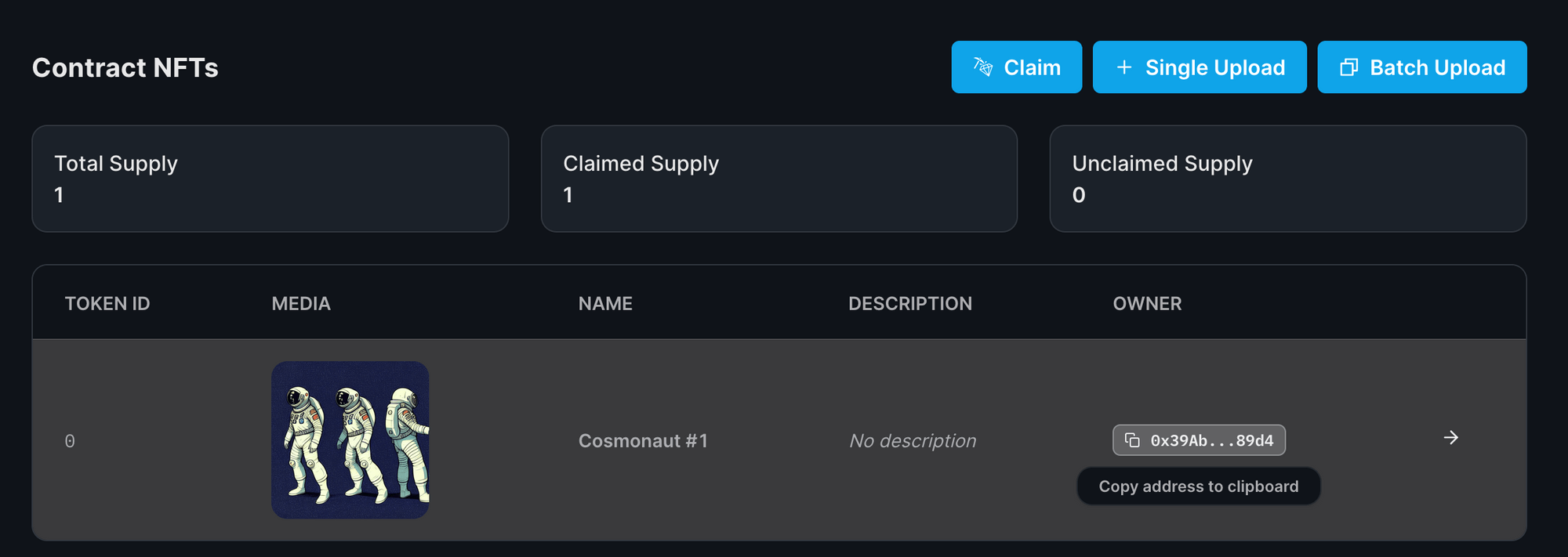 Na guia “NFTs”, você pode clicar no botão Claim (reivindicar) para gerar NFTS do seu drop diretamente no painel: