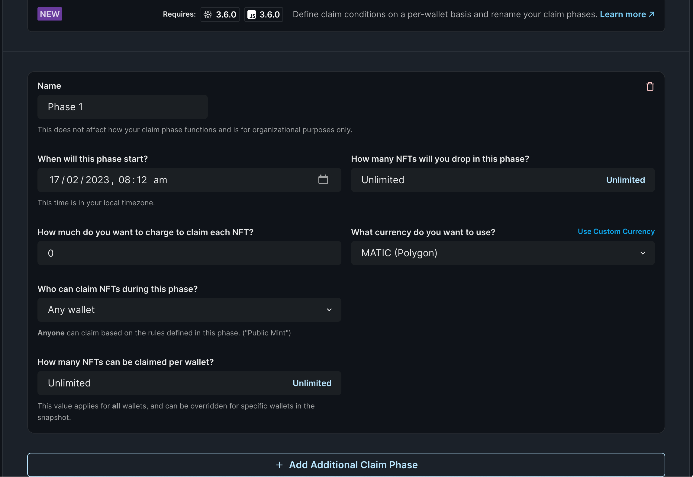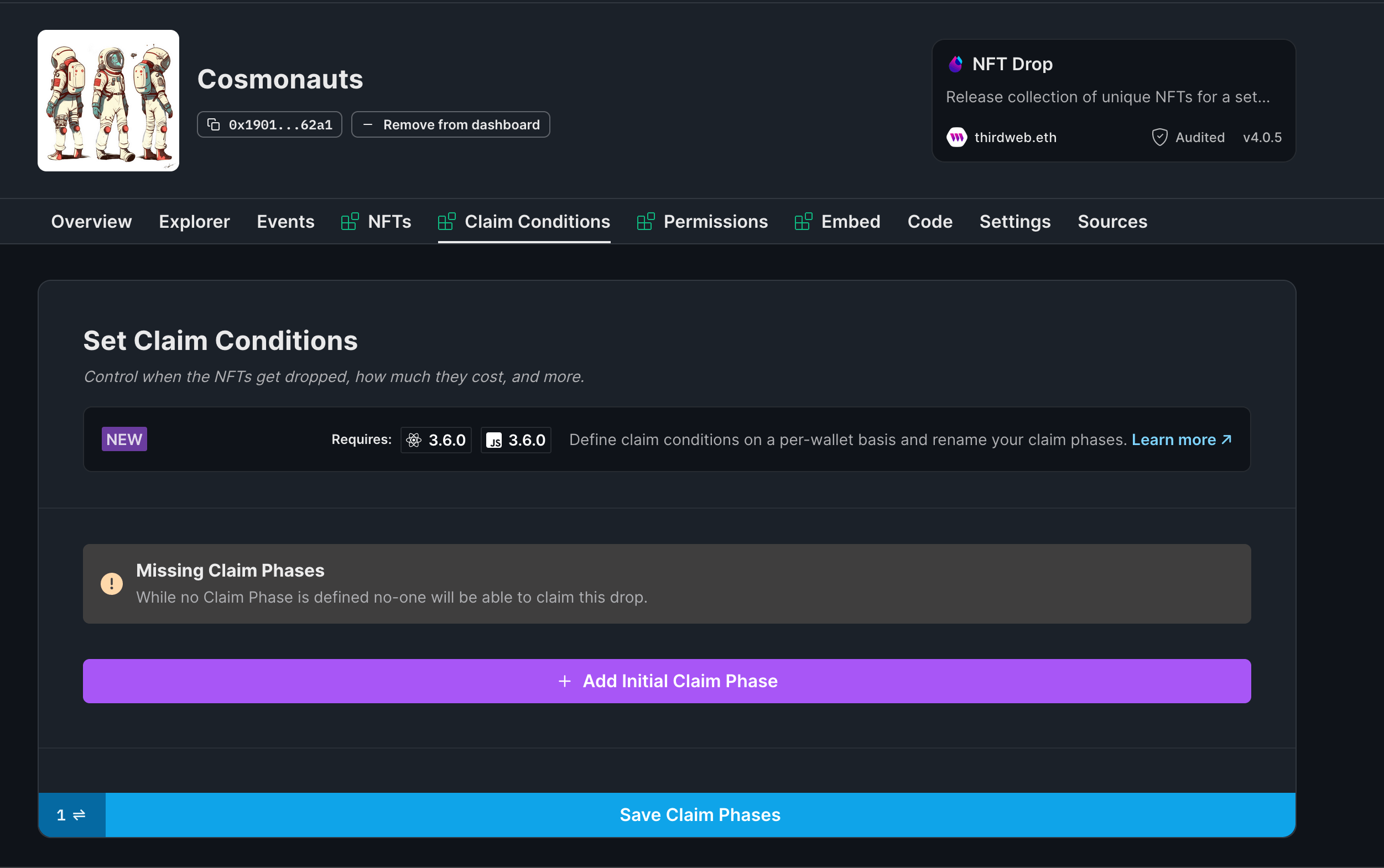 As condições de reivindicação são os critérios que definem quem, quando e como os usuários podem reivindicar um NFT do seu drop, como datas de lançamento, listas de permissões e limites de reivindicação.