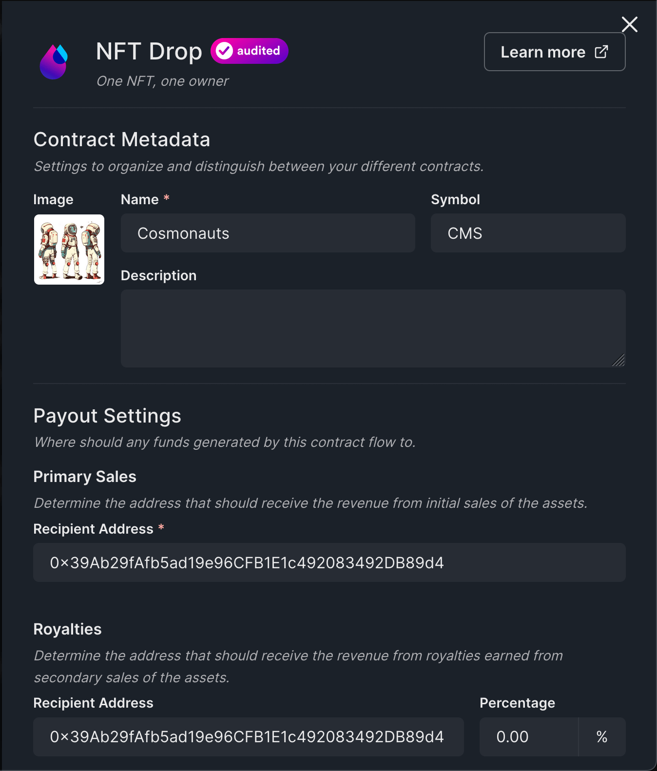 Defina seu contrato inteligente com uma imagem, nome, descrição, etc. e configure qual endereço de carteira receberá os fundos das vendas primárias e secundárias:
