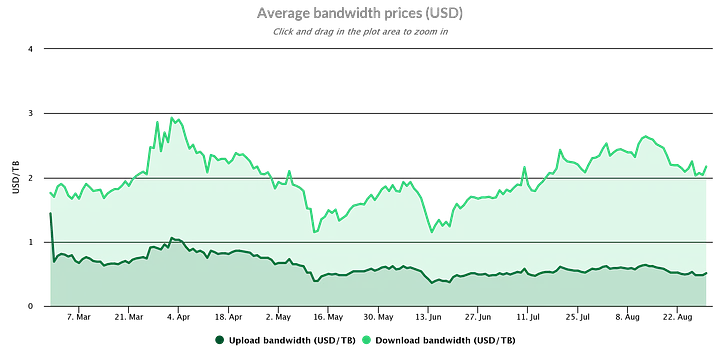 - O preço muda dinamicamente, agora com o preço de armazenamento mensal em torno de US$ 1/TB, preço de upload de US$ 0,50/TB, preço de download de US$ 2/TB.