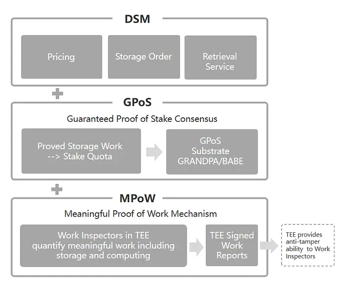 - MPOW (Meaningful Proof of Work ou Prova de Trabalho significativo) - é uma camada de prova de armazenamento de baixa confiança/confiança zero baseada em TEE (Trusted Execution Environment ou ambiente de execução confiável) serve como mensagens off-chain para inspecionar e provar o trabalho de armazenamento dos mineradores.