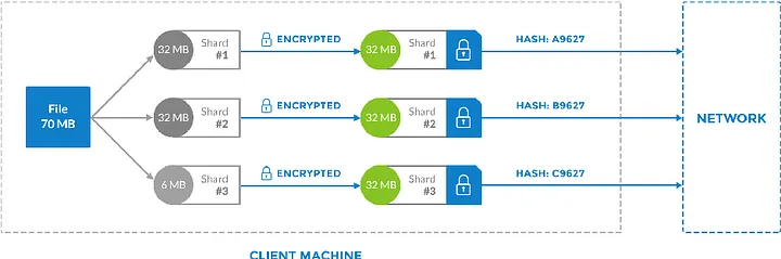 Os arquivos são divididos em 80 ou mais pacotes e colocados entre vários nós ao redor do mundo (total de mais de 14k). Apenas 29 pacotes são necessários para compor um arquivo para garantir buffer o suficiente em caso de falha de nós (novamente usando codificação Reed-Solomon) e alta disponibilidade > 99,9%.