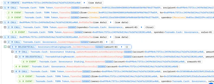 Depois de criar cada conta, o atacante bloqueou 0 TORN no contrato de governança.