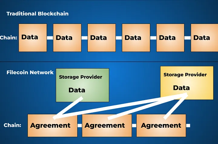 Ao invés de ser uma blockchain que armazena qualquer dado que recebe e que cresce tão rapidamente em tamanho que quase faz a unidade SSD no meu Intel NUC pegar fogo, a própria cadeia Filecoin apenas armazena acordos ou “negociações” entre provedores de armazenamento e pessoas que querem armazenar dados, ou locatários.
