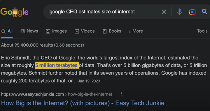 É estimado que, até este momento, a Internet tenha 5 milhões de terabytes de dados. Para efeito de comparação, um nó completo da Ethereum tem cerca de 1TB de tamanho.