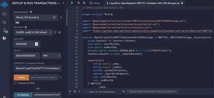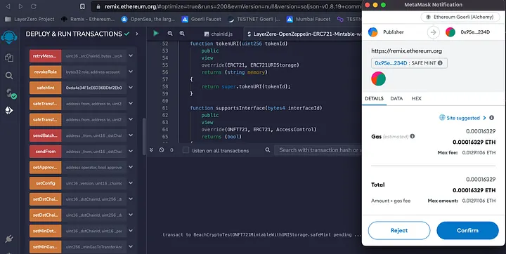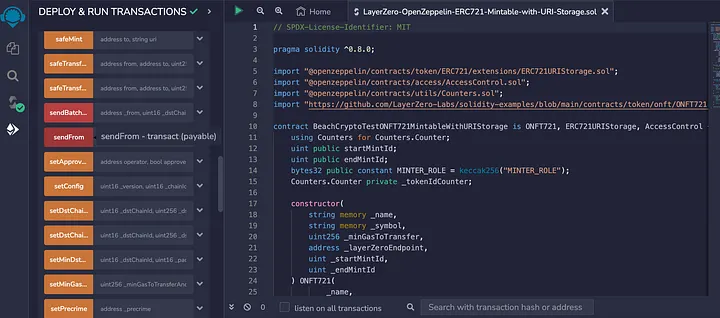 Depois de muitas tentativas fracassadas, muita pesquisa e um mergulho profundo nos exemplos de LayerZero Labs em Solidity, aprendi como implantar, cunhar e enviar um NFT ERC721 entre cadeias com o Remix. Em uma história anterior, criei um contrato ERC721 cunhável com armazenamento URI usando o Wizard de contrato do Openzepellin. Então, combinei esse contrato genérico com os requisitos do aplicativo de usuário do LayzerZero para criar um ERC72 LayerZero cunhável do Openzeppelin com armazenamento URI. O contrato está disponível no meu repositório no GitHub.