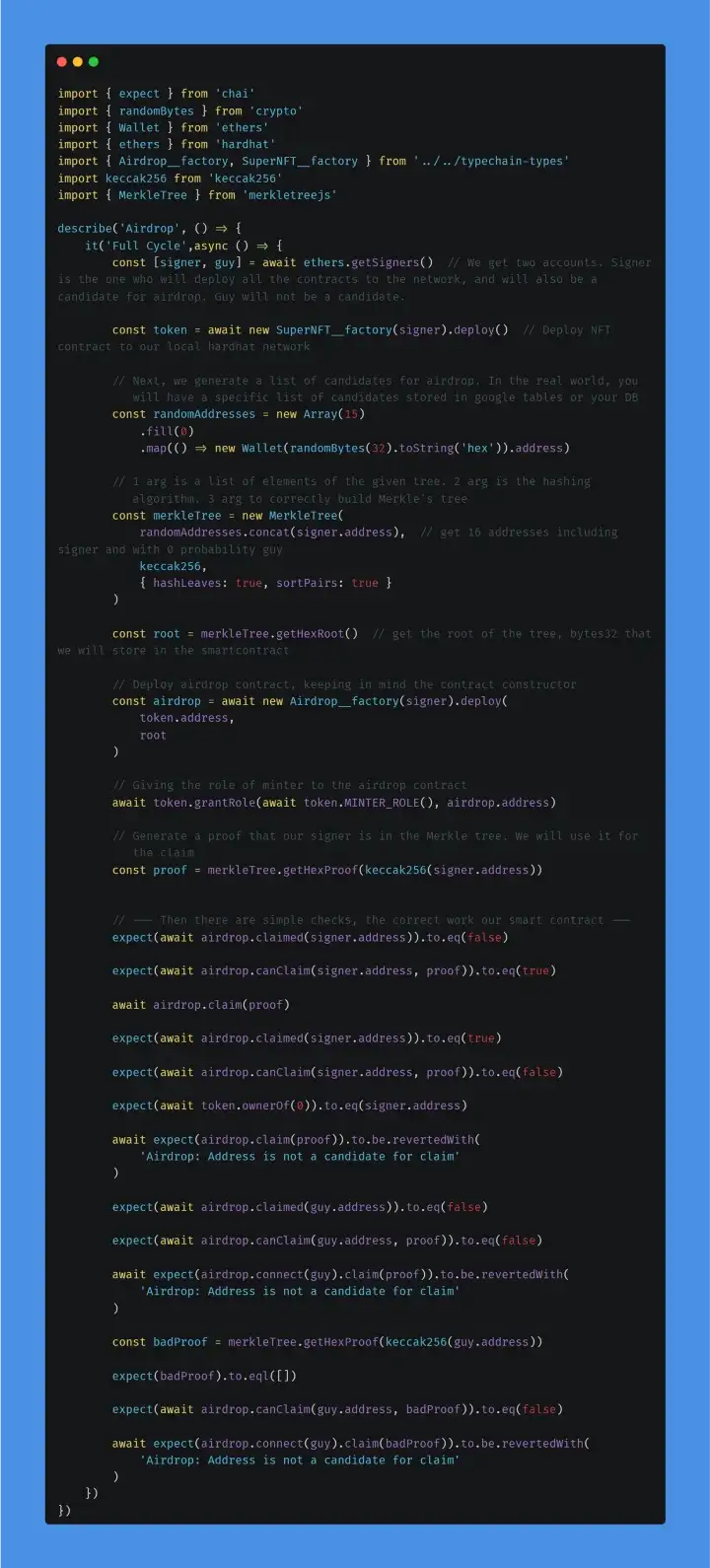 Vá para a pasta test/nft-airdrop/, no arquivo Airdrop.test.ts.
