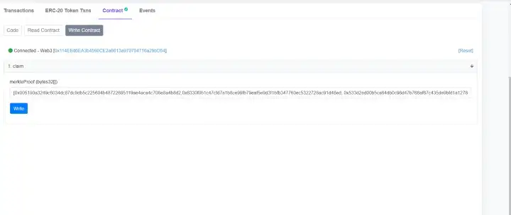 Em seguida, digite no campo (1.claim - merkleProof (bytes32[])) 4 hashes sem aspas, entre colchetes, que você obteve na exclusão.