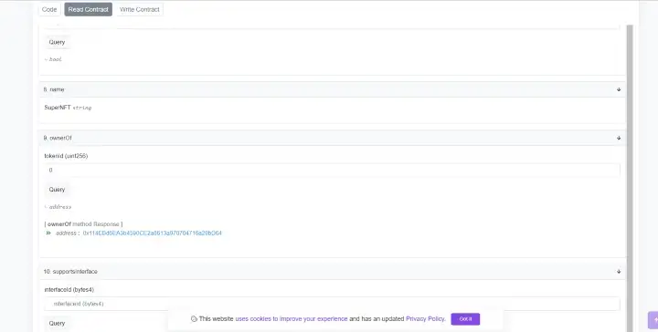 Agora, se formos para o endereço do nosso contrato de NFT e na aba “Read Contract” (Ler contrato) e no método “ownerOf” inserimos 0 (o proprietário do primeiro tolen NFT), vemos o endereço da nossa carteira.