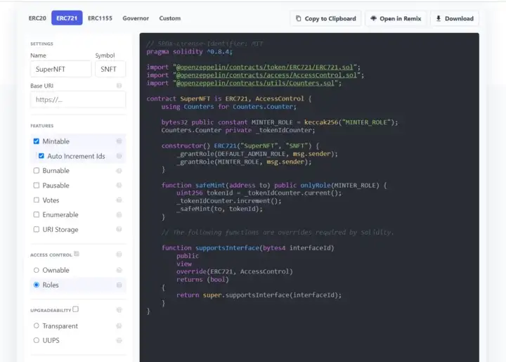 Primeiro, colocamos a possibilidade de criar um novo NFT (propriedade cunhável) e adicionamos a propriedade AutoIncrementIds, para que o contador de NFTs cunhados aumente (incremente) automaticamente e nós não precisemos escrever funções adicionais. Adicione também a propriedade Roles (funções), para que tenhamos um administrador principal, assim como uma função de cunhagem, que vamos entregar ao contrato Airdrop (o contrato poderá criar NFTs e distribuí-los a endereços adequados). Copie esse código, precisaremos dele mais tarde.